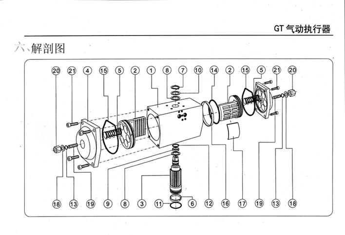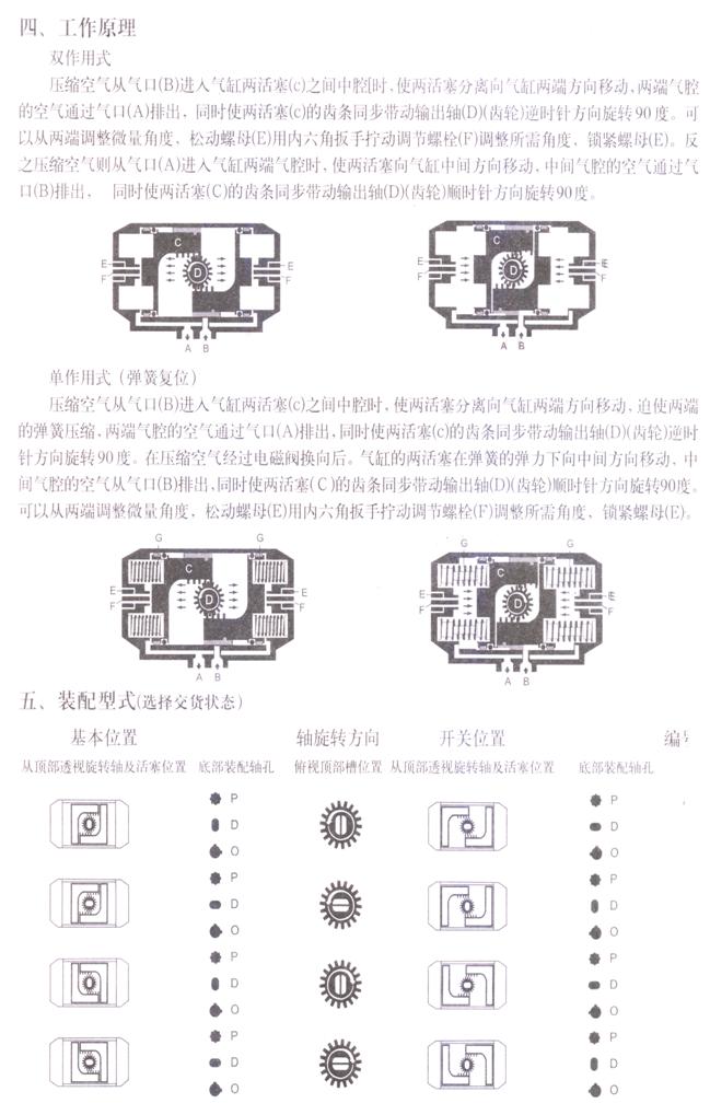 活塞及齿轮和壳体接触面有低磨擦材料制成的滑动轴承衬套、导向。 单作用式有保险弹簧座。