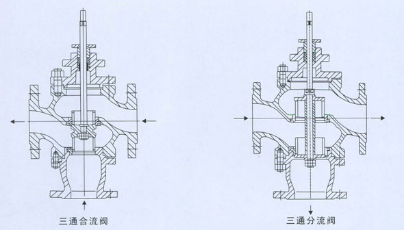 V51344/5型气动薄膜三通合流、分流调节阀采用圆筒型薄壁窗口形阀芯导向,不同于柱塞形阀芯的衬套导向。配用多弹簧执行机构,具有结构简单、重量轻、体积小、拆装方便等优点。广泛应用于精确控制气体、液体等介质的工艺参数如压力、流量、温渡、液位。适合于把一种流体通过三通阀分成二路流出或是把两种流体经三通阀合并成一种流体的场合。本系列产品有三通合流及三通分流两种。公称压力有PN16、40、64;公称通径范围DN25-300。适用流体温度由-60~450。泄漏量标准为IV级流量有直线、抛物线两种。
