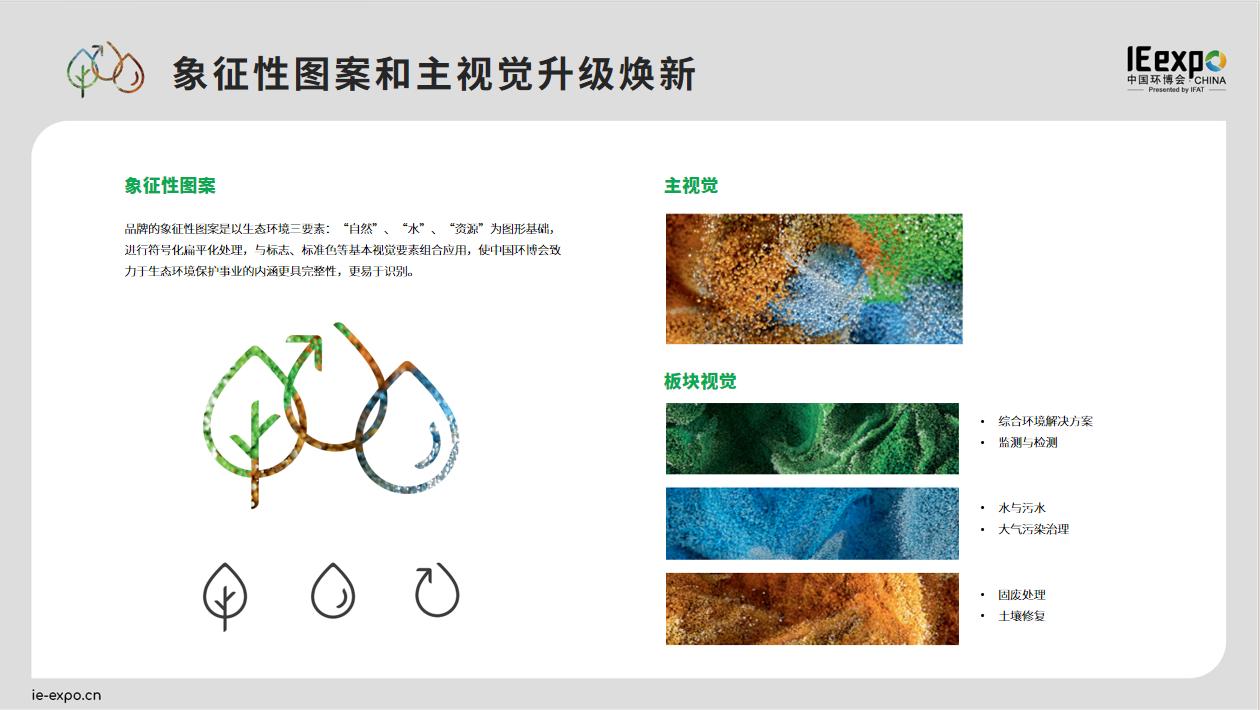 回顾中国环博会IE expo历经的品牌形象演变,不难发现每次变化都紧密关联着品牌发展的不同阶段。2014年,品牌主视觉使用互相融合的具象化环保元素,充分展现了中国环博会IE expo展示环境污染治理技术的平台属性,并一直沿用至今。而此次品牌形象升级,将象征性图案抽象化符号化,主视觉使用代表不同产业板块的粒子融合图案,则凸显了中国环博会IE expo致力于发掘纯粹的、面向未来的环境技术的决心,以及展现了中国环博会IE expo作为旗舰平台的品牌形象和对高质量发展的承诺。