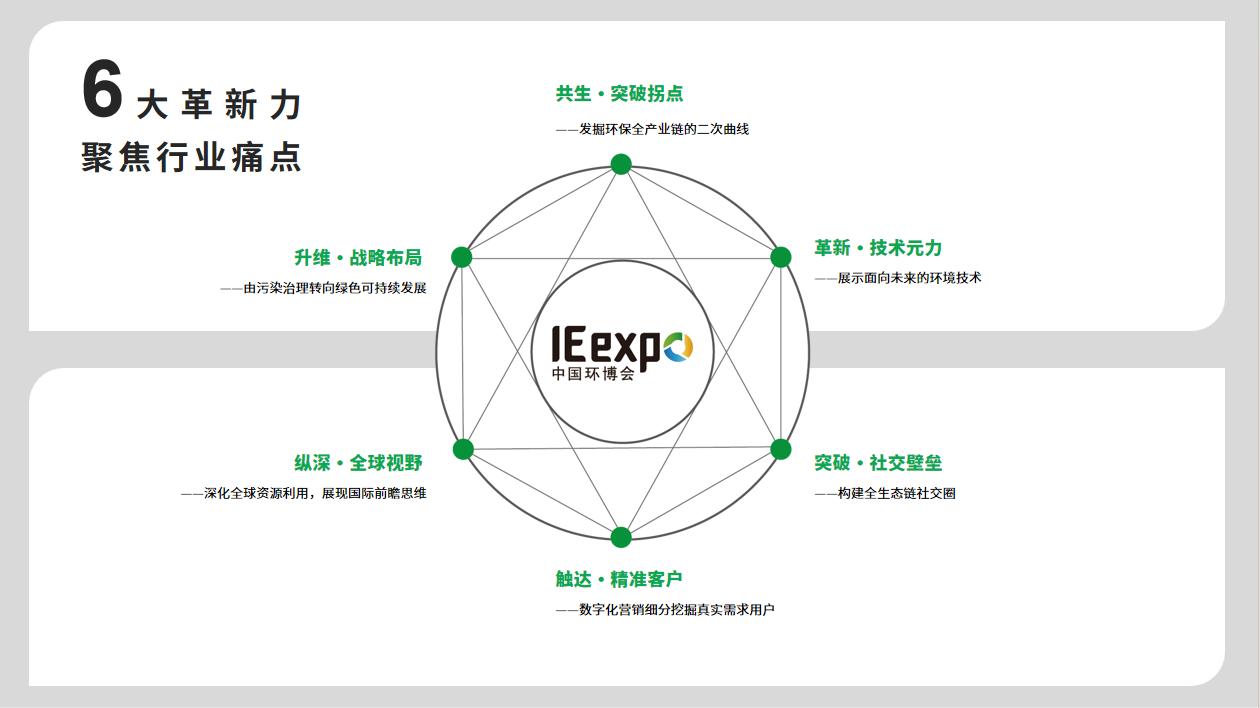 为适应当前的发展形势,中国环博会IE expo将持续推进六大能力的自我革新,即:一、拓展数智化等跨界产业与传统环保产业的共融交集,提升平台“共生力”,发掘环保全产业链内的发展第二曲线;二、由污染治理转向绿色可持续发展,培育在碳中和领域的战略布局,提升平台“升维力”;三、展出面向未来的环境技术,提升平台“革新力”,提升环保科技创新动能;四、深化IFAT全球资源的利用,展现国际前瞻思维,提升平台“视野力”;五、创造平台打破创新链、产业链、资金链、人才链的融合壁垒,提升平台“社交力”;六、深化数字营销体系,配合发起关键营销战役,精准聚拢真实需求用户人群,提升平台“触达力”。