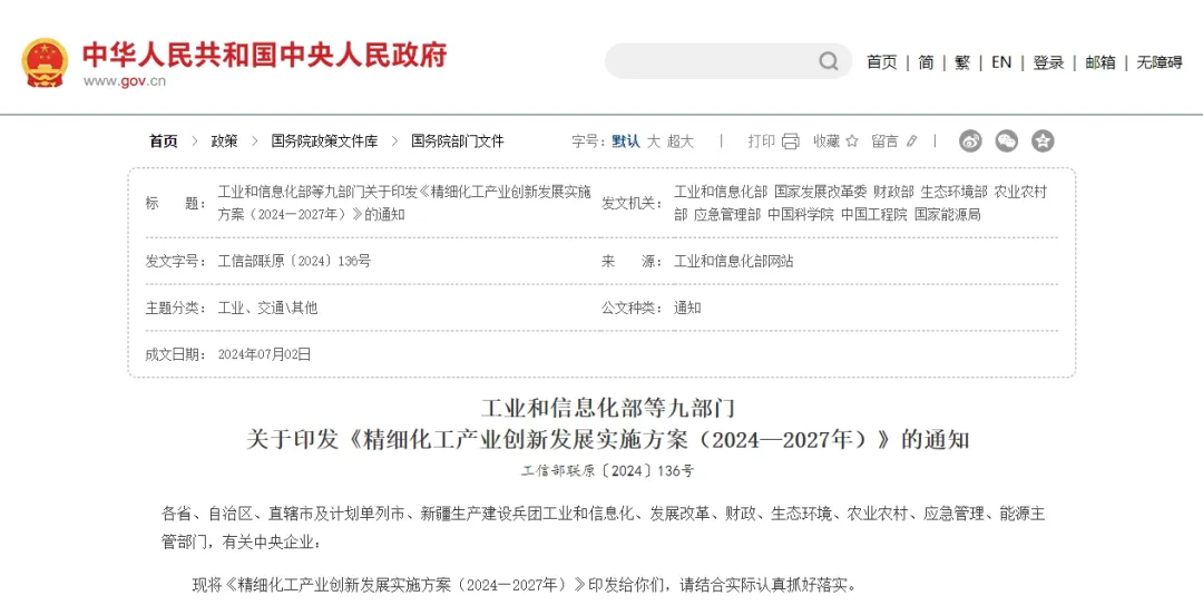 2024年7月,工业和信息化部、国家发展改革委、财政部、生态环境部、农业农村部、应急管理部、中国科学院、中国工程院、国家能源局等9部门联合发布《精细化工产业创新发展实施方案(2024—2027年)》(以下简称《实施方案》)。《实施方案》中明确在生物化工行业、农药染料、安全化技术等诸多方面大力倡导、实施推广“微通道反应器及管式反应器工艺技术”,助力精细化工产业高端化、绿色化、智能化发展。