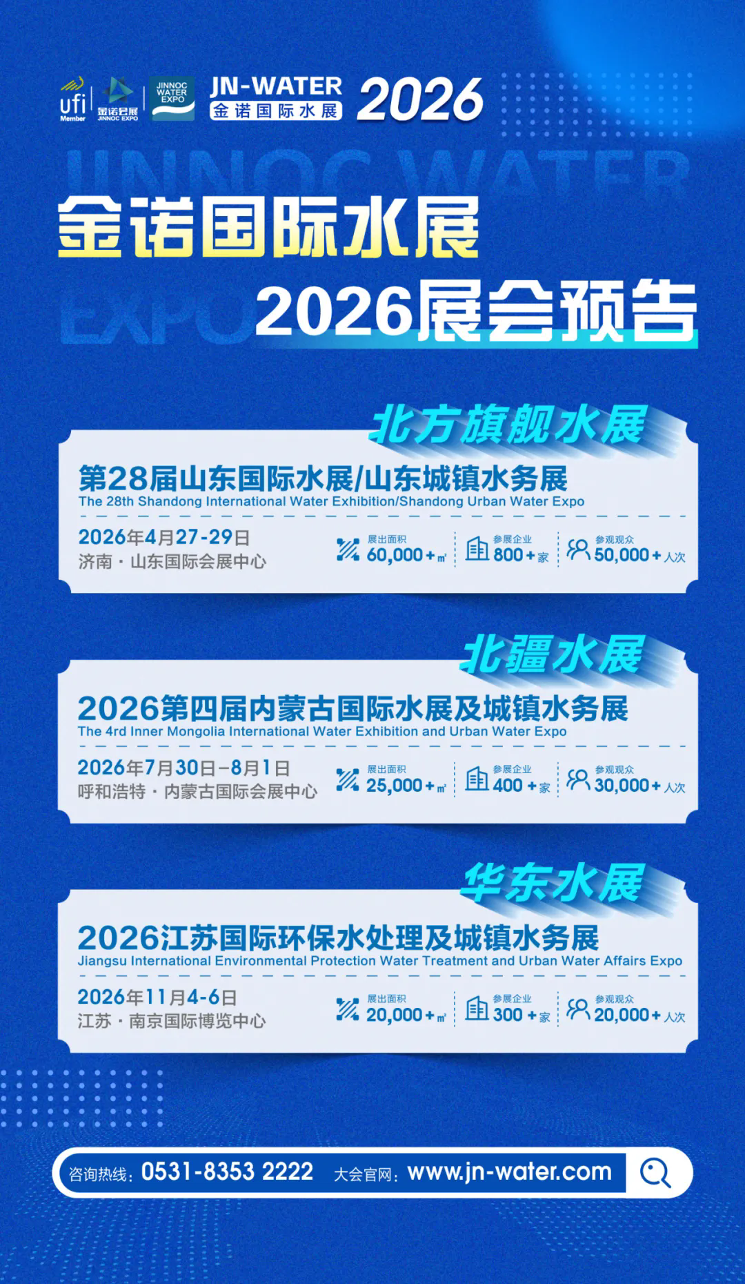 规划展示面积超60000㎡,聚焦膜与水处理、末端净水及氢科技、环保水处理、污水/废水设备及配套、建筑给排水、城镇供排水、智慧水务、泵管阀及智慧环保水环境综合治理共八大核心领域,实现工业、市政、民用全场景覆盖,为企业提供专业化、精细化的展示平台,让技术与产品的核心优势高效传递。依托济南、江苏、内蒙古三展联动的创新模式,展会将整合1000+家参展商资源与80000+名专业观众流量,精准辐射北方核心市场,助力企业构建完善的区域营销网络。