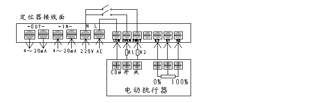 定位器与电动执行器通过一个七线接插件连接,其中定位器上GND端可以与电动机执行器外壳连接或悬空不接;RO、RV、RS分别接电动执行器内的反馈电位器的三个端子,其中RV接电位器的滑臂,RO接执行器开动作与滑臂之间电阻不断减小一端,RS则接另一端;SHUT、OPEN、COM分别接执行器伺服电机的闭、开、COM端子。 注:为了减弱执行器启动停止时电流冲击,一般在“OPEN”、“CLOSE”分别与执行器中的“开”、“闭”间接上4Ω/5W的水泥电阻(如图下R1、R2)。 注:定位器COM、OPEN、SHUT为有源输出端子,COM、OPEN与COM、SHUT对应输出电压为电源电压。