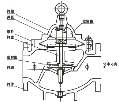 所以就会把主阀阀盘压到完全关闭的位置;主阀阀盘就处于调节状态,其调节位置取决于导管系统中的针阀和可调导阀的联合控制作用。可调导阀可以通过下游的出口压力并随它的变化而开大或关小其自身的小阀口, 从而改变隔膜 (活塞)上方控制室的压力值,控制主阀阀盘的调节位置。