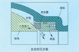 自动泄压功能(见图三):当阀门中腔停滞的介质压力异常升高超过弹簧的预紧力时,阀座后退脱离球体,达到自动卸压的效果,卸压后阀座自动复位。