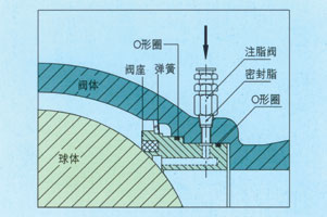 可修补密封面(见图四):本阀门设计有辅助的阀座紧急密封系统,一旦密封受损或出现紧急情况而不能密封时,通过辅助密封系统向密封面注射相应的密封剂即可修复密封面,达到紧急密封。当输送的介质不洁或含有少量颗粒时,为保护密封面,确保达到可靠的密封,还可给这一装置注射相应的清洗剂或润滑剂对密封面进行清洗。