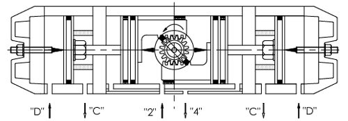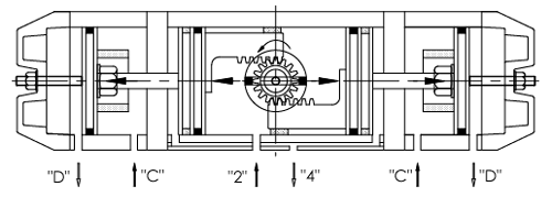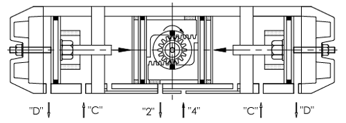 From chart 2 we can see that this position is obtained when air is supplied to port 2 and port D, meantime, port 4 and port C are in the state of exhaust air. In fact that the midway position is achieved by a mechanical stop of movement on the two auxiliary pistons.  |
