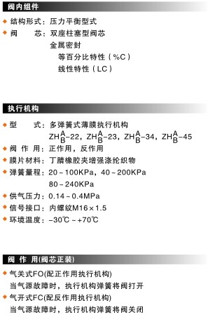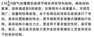 ZMA/BN气动薄膜双座调节阀采用双导向结构,阀体结构紧凑.流体通道呈S流线型,压降损失小流通量大,可调范围广,流量特性精度高。