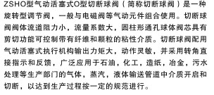 ZSHO型气动活塞式O型切断球阀是一种旋转型调节阀,一般与电磁阀等气动元件组合使用,广泛应用于石油、化工、造纸、冶金、污水处理等行业中