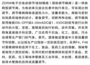 ZDRW型电子式电动调节密封蝶阀,采用衬胶衬里蝶阀特别适用于食品、饮料、医药化工等纯净管路及工业环保、水处理、高层建筑、给排水管路的启闭或流量调节。